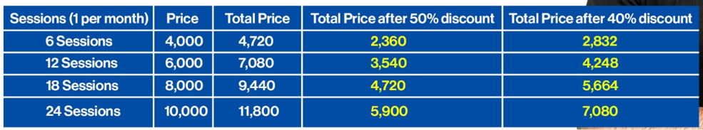 This mentorship follows a one-session-per-month structure, with flexible plans available for 6, 12, 18, or 24 sessions, allowing you to choose what suits you best.